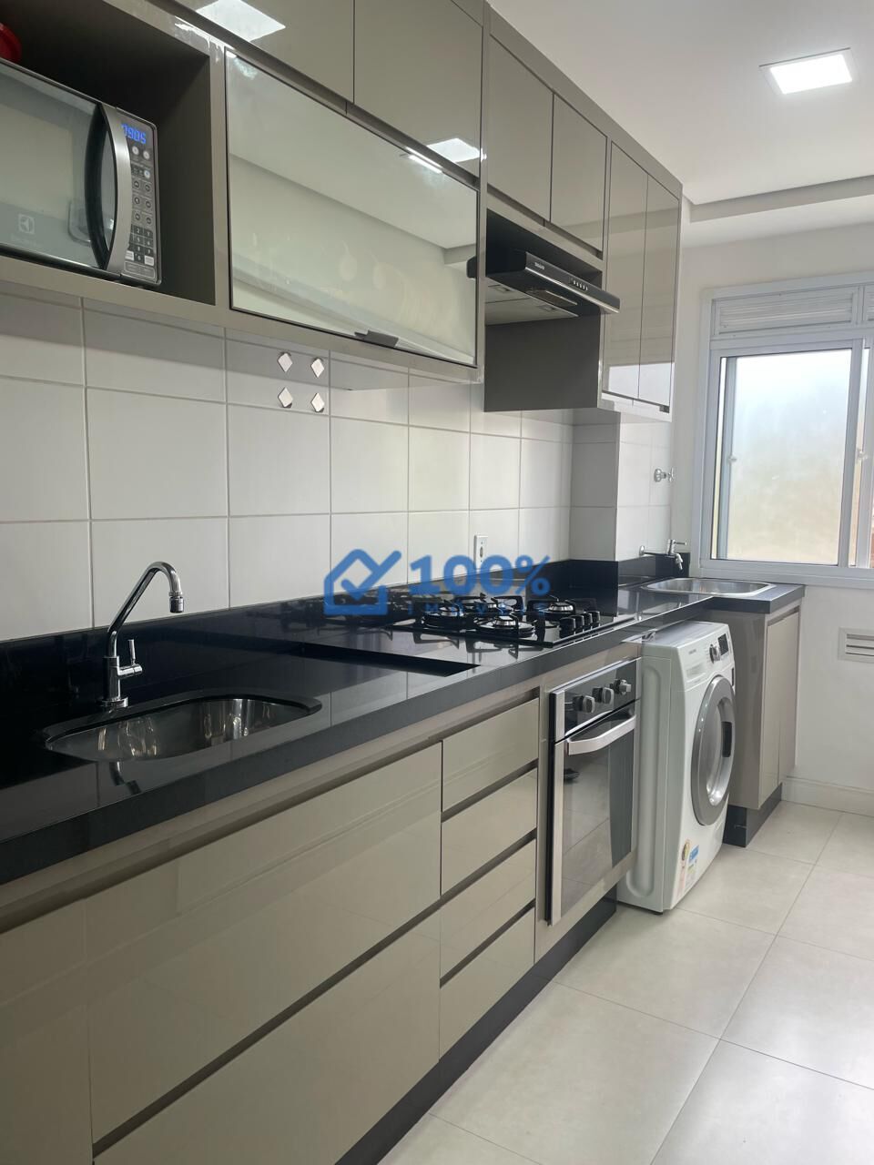 com armários, forno, cooktop, bancada com granito preto absoluto.